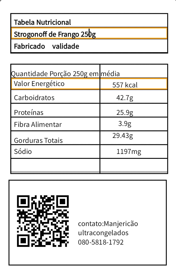 Strogonoff de frango : pedaços de peito de frango temperados com creme de leite fresco, alho, cebola, especiarias e ervas finas, acompanha batatas rústicas.